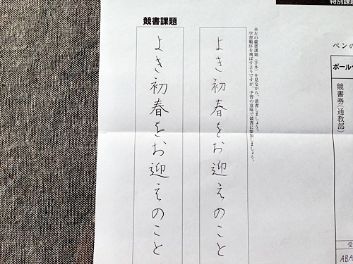 先日の記事で『ペンの光』に作品を提出するには字が汚いと書いた特別課題も提出しました。競書課題は「こんな字を書いたことがないよ~」と思うほど、綺麗な大人の字です。練習もなく、お手本をじっと見ながらの清書でしたが、書き上がりました。
